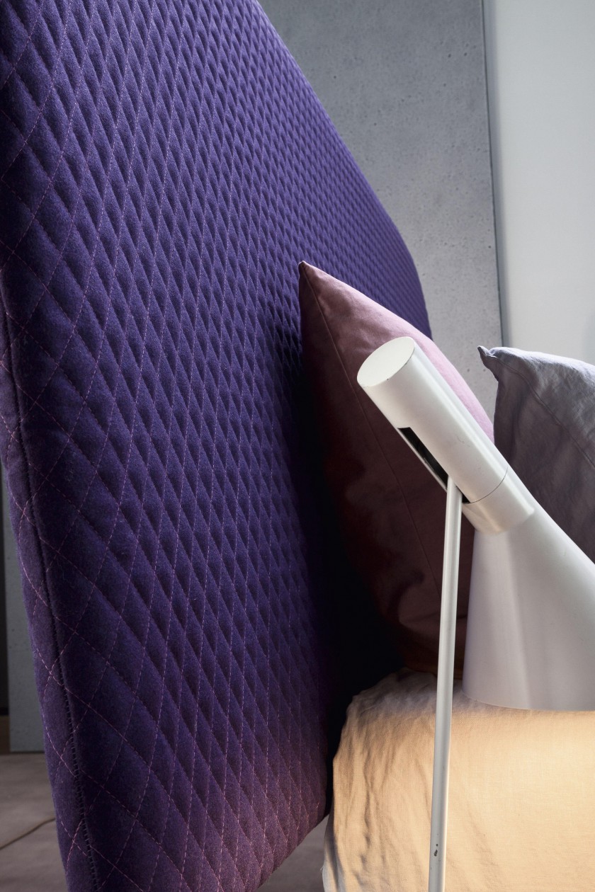 The headboard should be read as a sort of canvas that is set on a structure and is thus turned into a functional element. Thanks to its angled position it provides extra comfort to a person that would, for instance, be reading or working in bed.