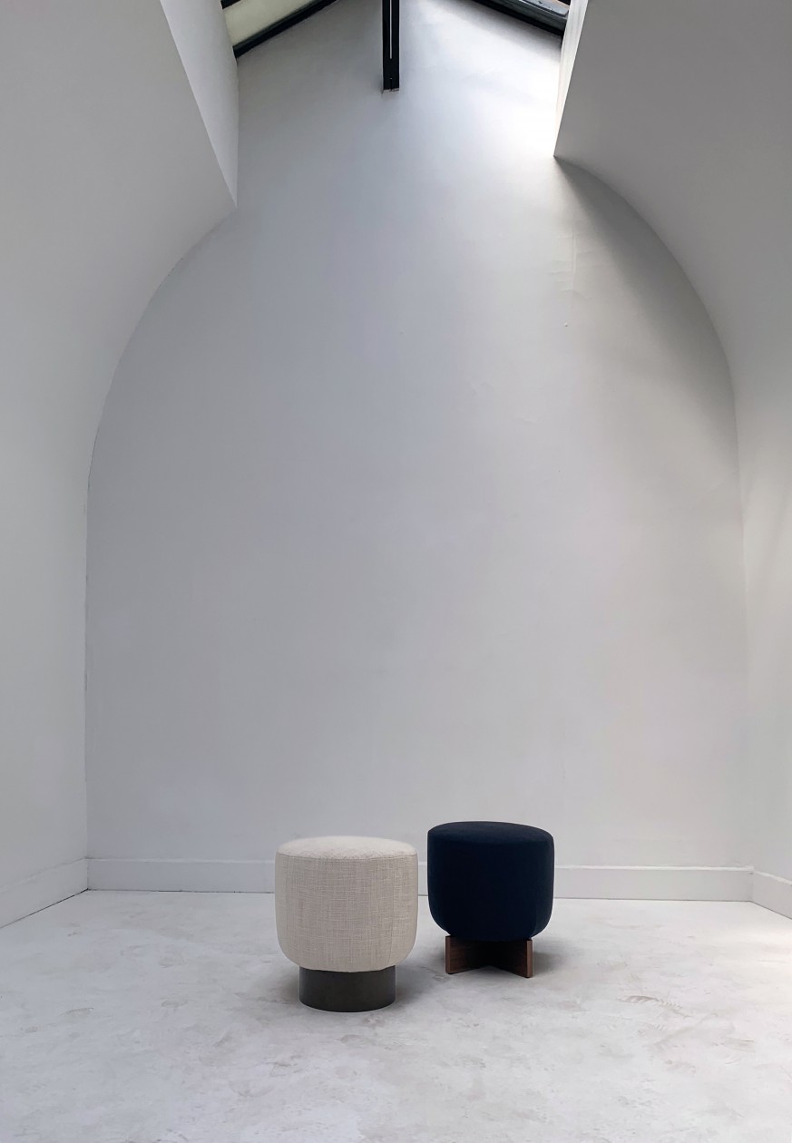 Both pouffes play with the somewhat timeless vision of a pouf, while boasting subtle detailing. Their large curved bottom gives them an extra sense of refinement and warmth, but also a light, fresh feel. The upholstered section has no straight lines, only curved surfaces that softly complement each other.