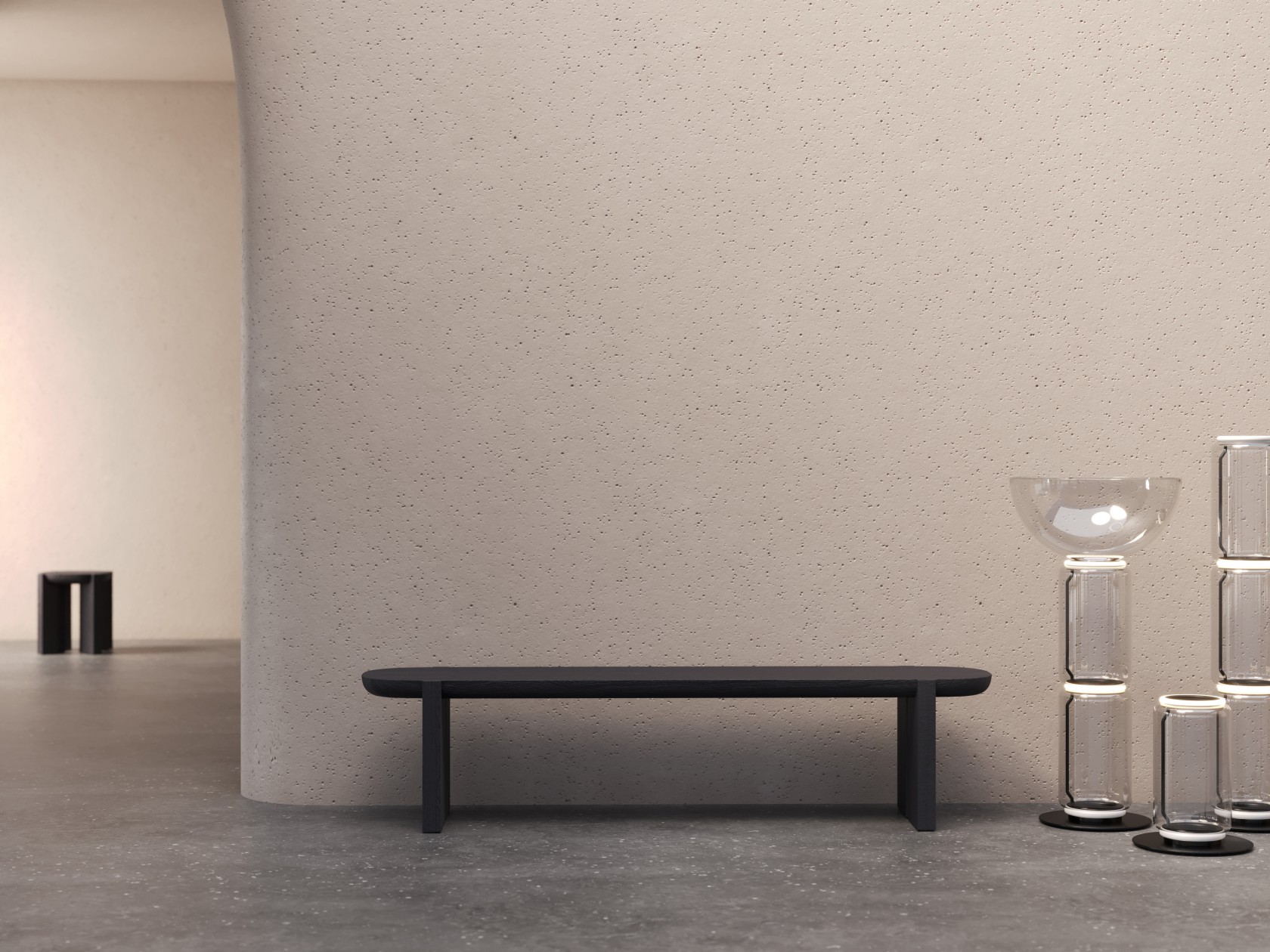 Another key element of the collection is the difference, the contrast between the different elements in the pieces is also visually highlighted by the different finishes used on the legs and top. The vertical elements, legs and columns, are sanded very deeply, giving them a very rough and matte texture, while the horizontal elements, the tabletops, are smooth and polished. Although the same solid oak is used throughout the collection, the pieces appear to be made of two different materials. The roughness of the legs makes them look almost as if they were made of a porous stone such as lava stone or wood charcoal.