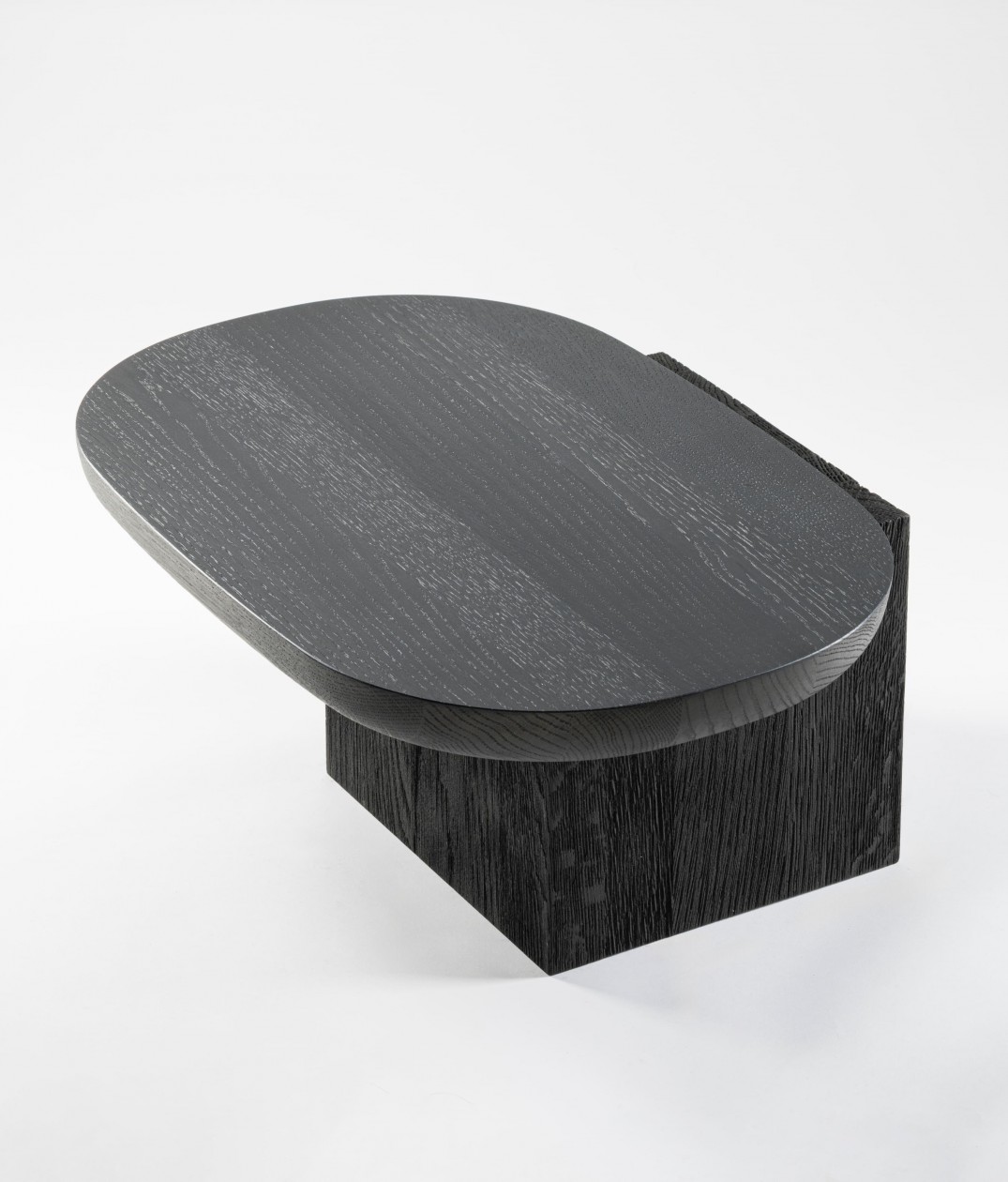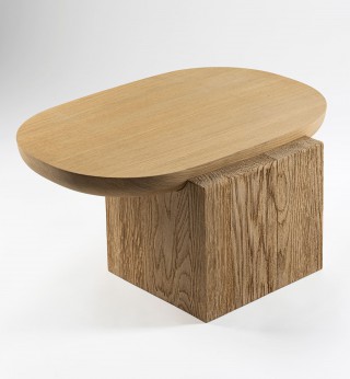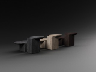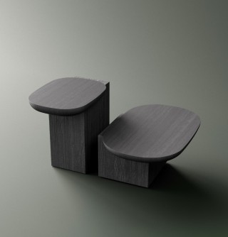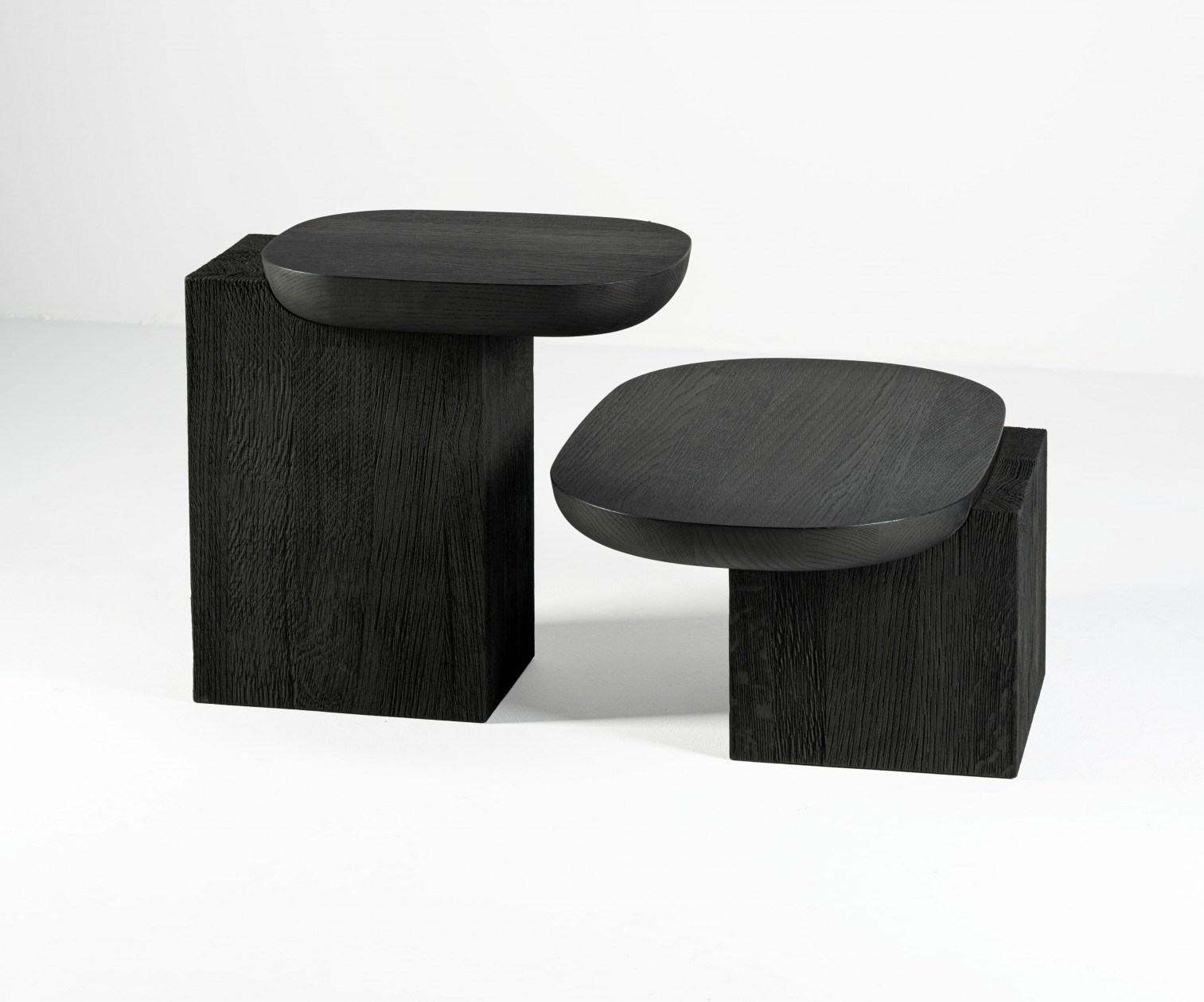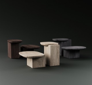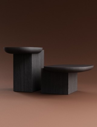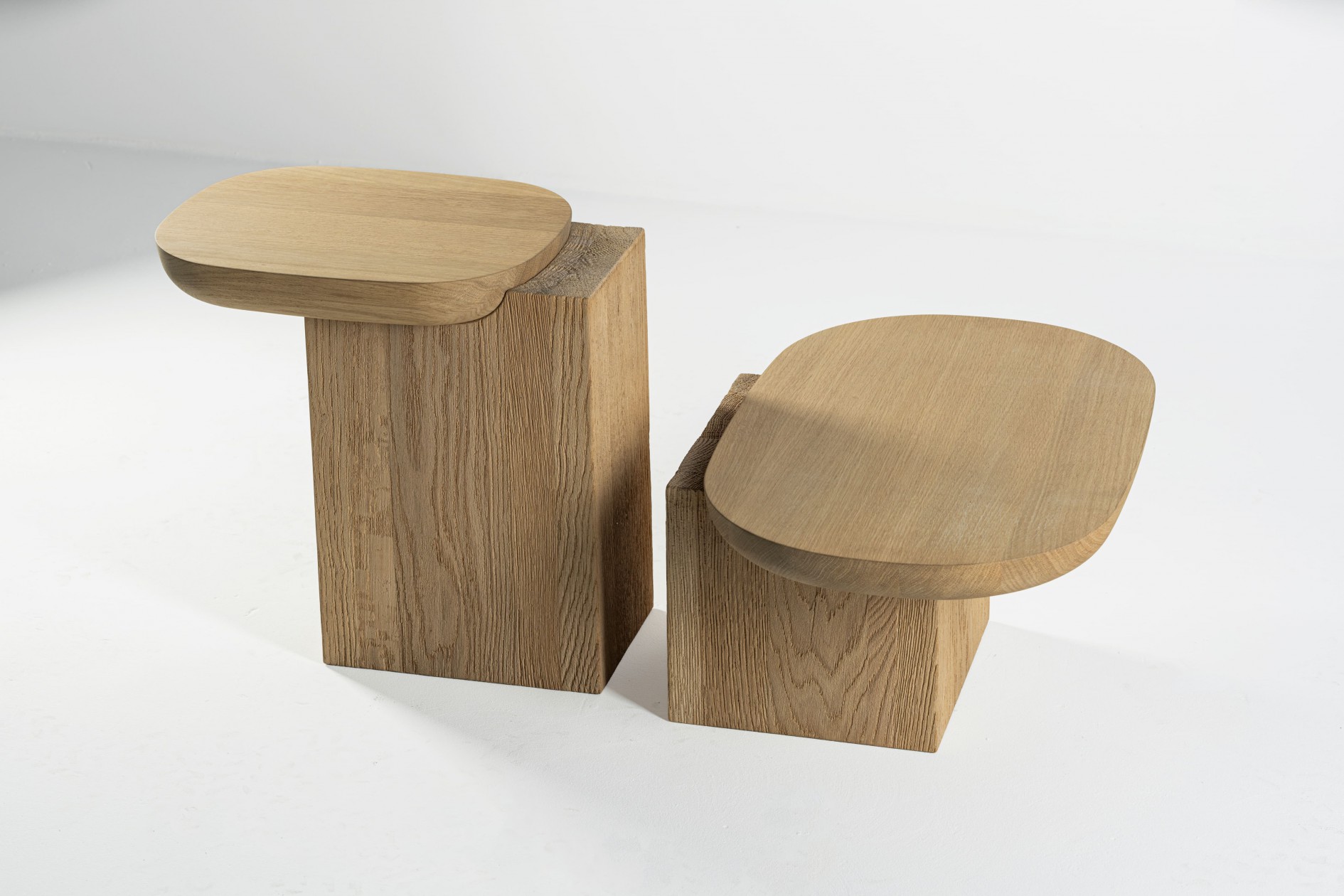 This dialogue between mass and delicacy, or at least a certain lightness since both parts of the tables are made of solid wood, is also a dialogue between stability and balance. This is even more evident in the smaller side tables, where the tops seem to float. This impression is reinforced by the way they are visually connected to their base, as they seem to rest in a groove without being fully supported. The tabletops give the impression that they are trying to reach for something, much like the tray held by a waiter who is about to serve you in a restaurant.