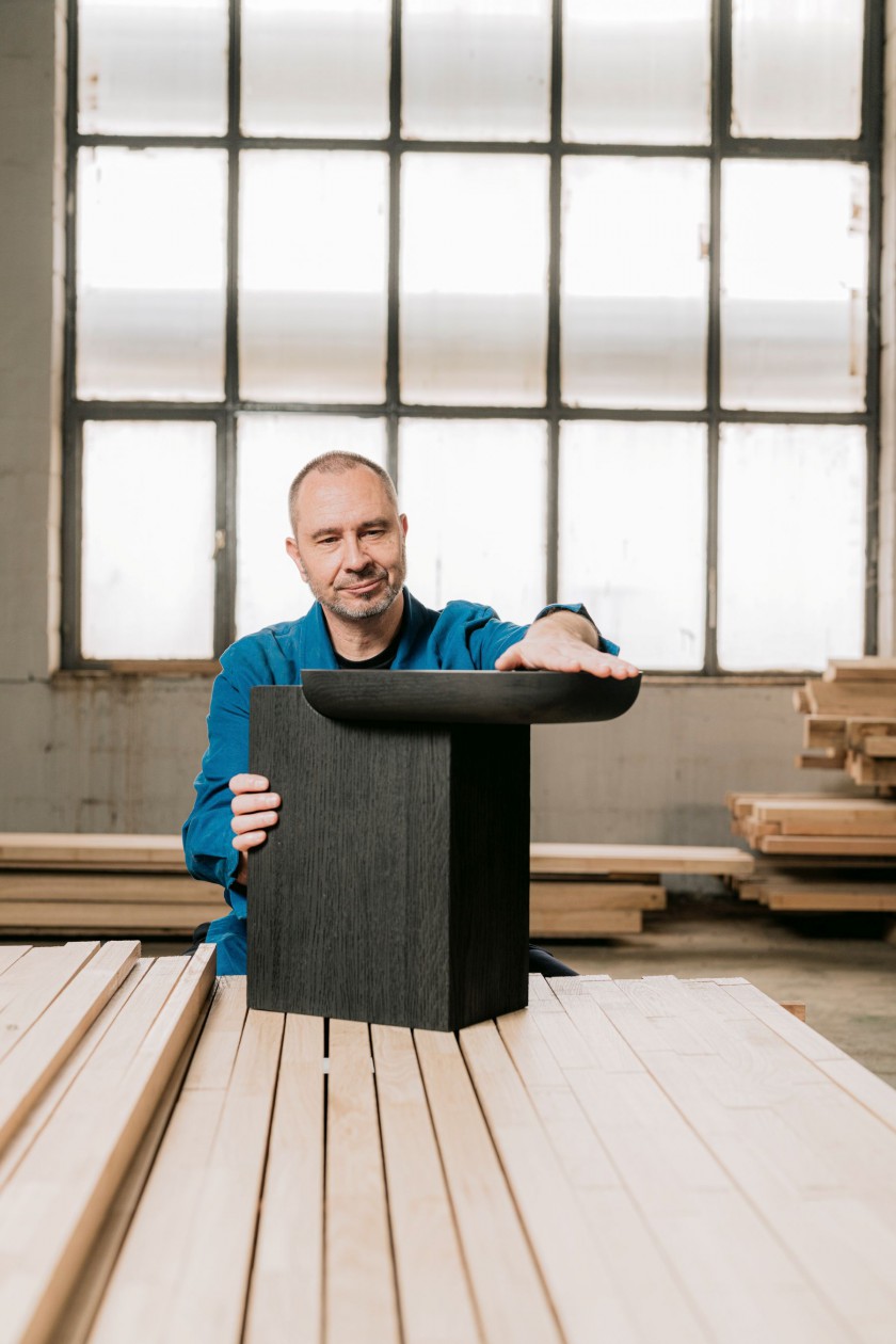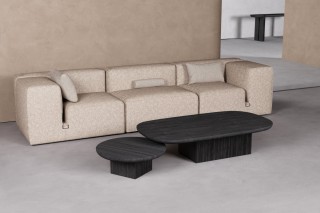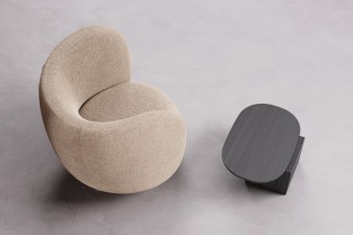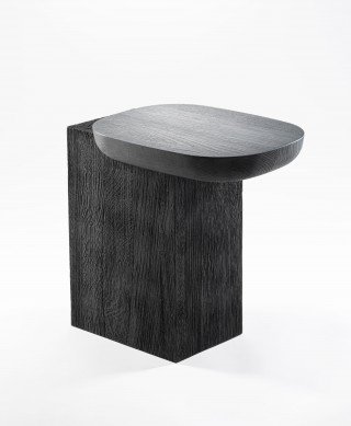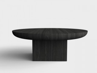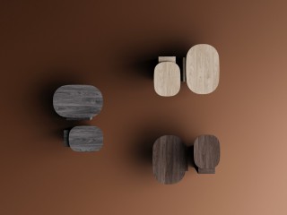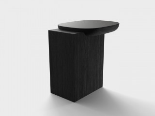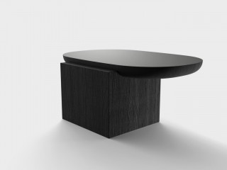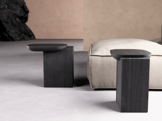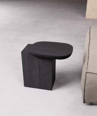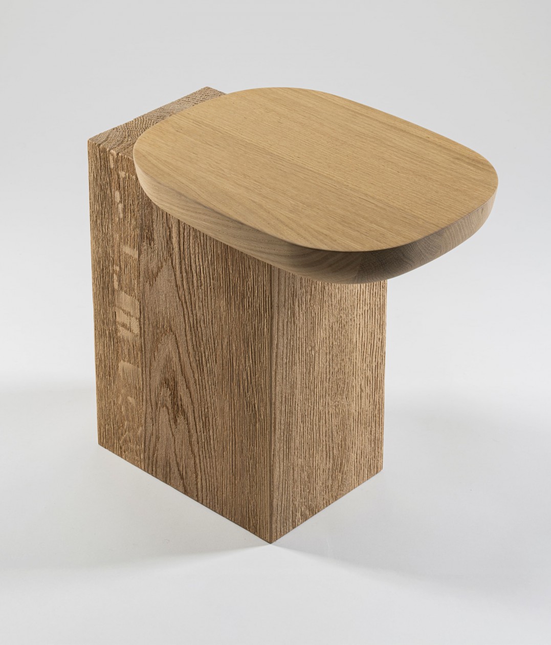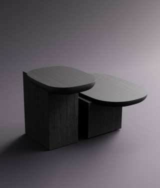 This dialogue between mass and delicacy, or at least a certain lightness since both parts of the tables are made of solid wood, is also a dialogue between stability and balance. This is even more evident in the smaller side tables, where the tops seem to float. This impression is reinforced by the way they are visually connected to their base, as they seem to rest in a groove without being fully supported. The tabletops give the impression that they are trying to reach for something, much like the tray held by a waiter who is about to serve you in a restaurant.