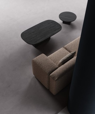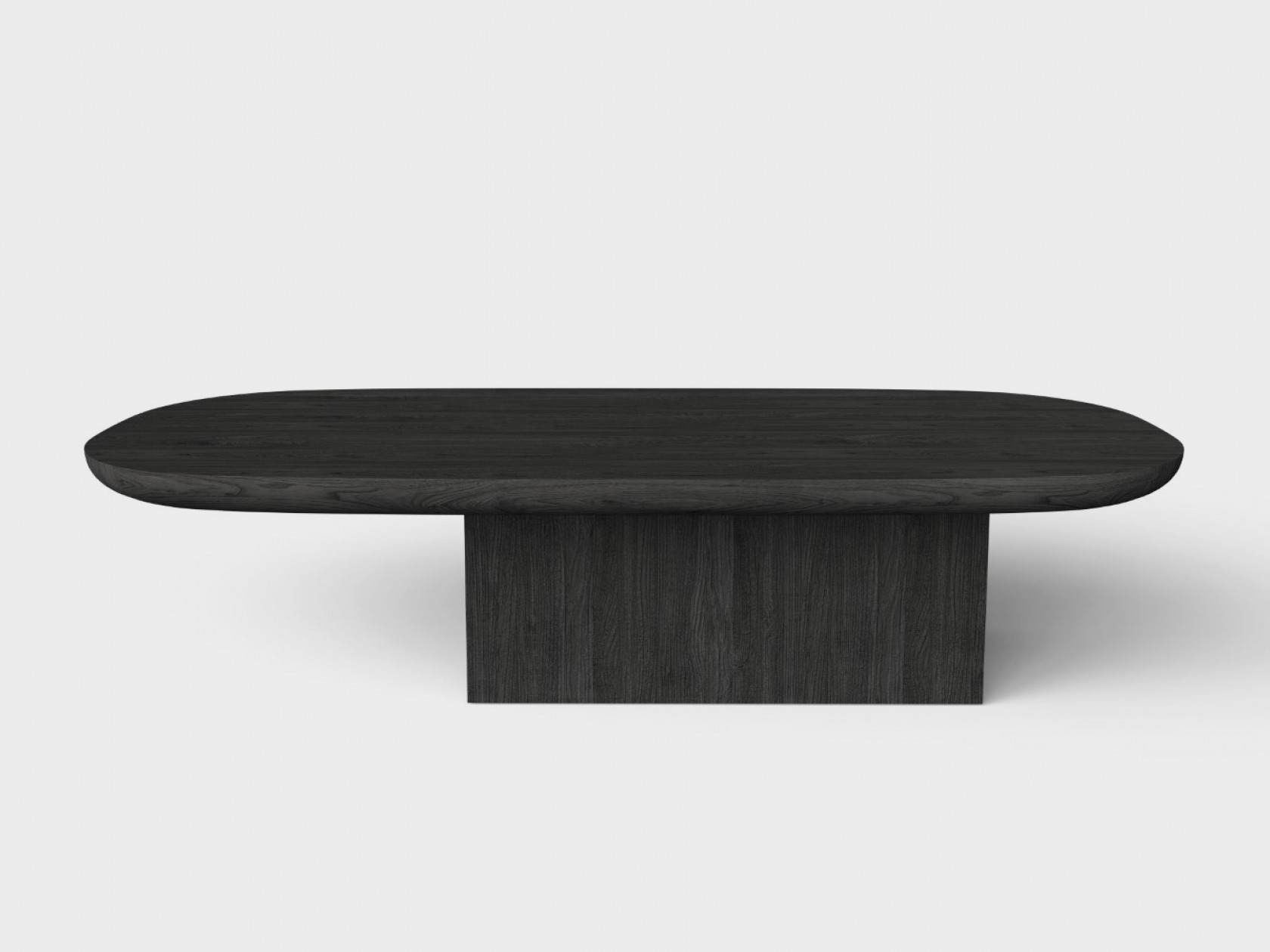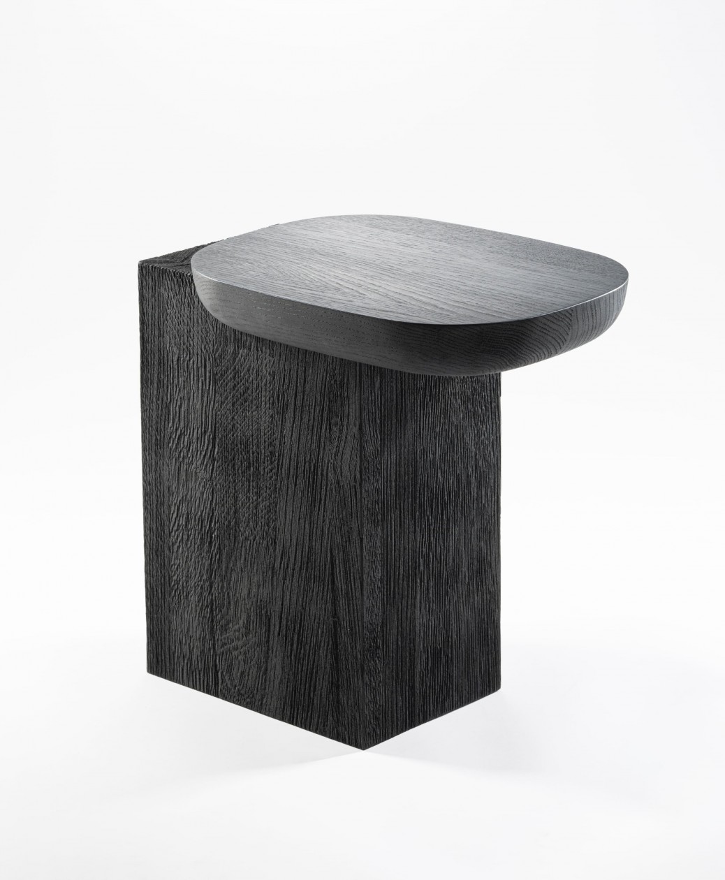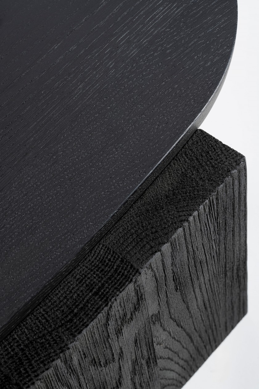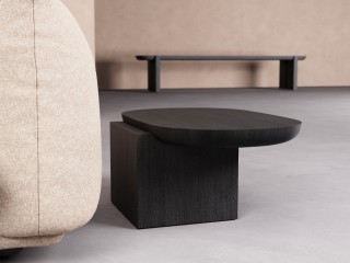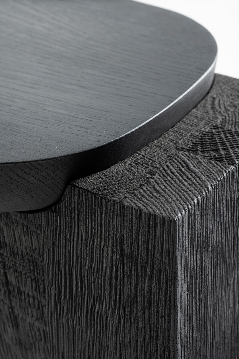 The dialogue between the two elements is reinforced by the use of contrasting wood finishes. The same rough and textured wood finish developed for the legs of the Edge collection is used for the bases, giving them this deep porous matte finish that resembles charcoal or lava stone when in black. As for the tops, they feature a contrasting smooth finish that also makes them easier to clean.