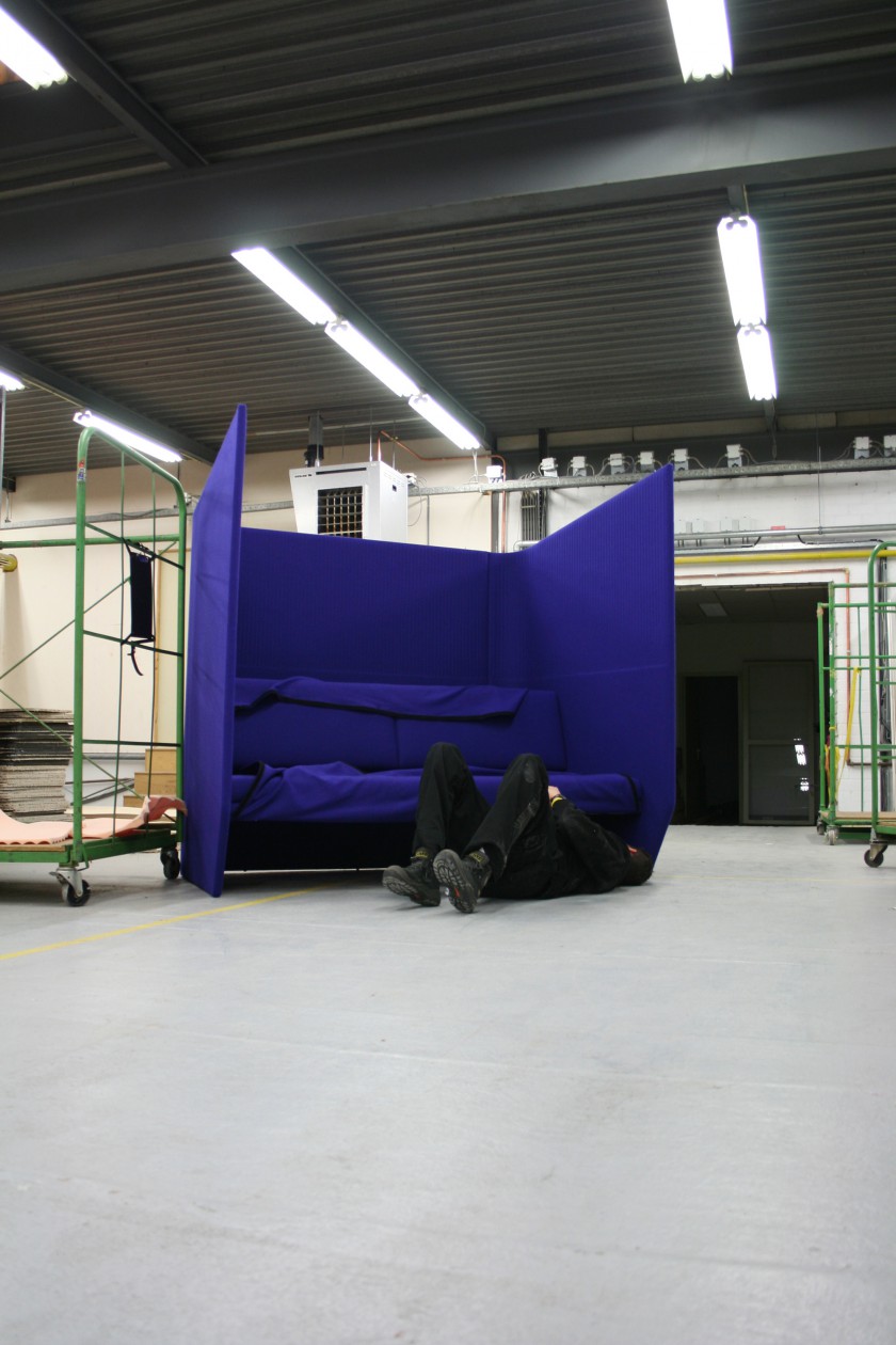 It was designed to feel comfortable but never-the-less to be in a position favoring a working attitude and concentration. Hence, for instance, the large cushion on the side that doubles as armrest is fairly stiff so that it can serve as support for the arm when typing on the computer and using one of the BuzziTables.