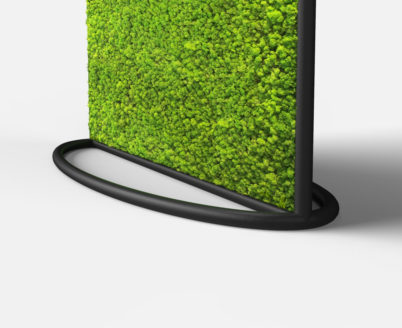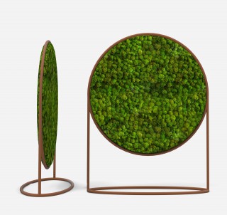 The G-Screens are modular screens designed to be used as standalone elements or in relation with one another to define new space within a space. They are circular moss-covered panels attached to a free-standing metal framework that act as screens.