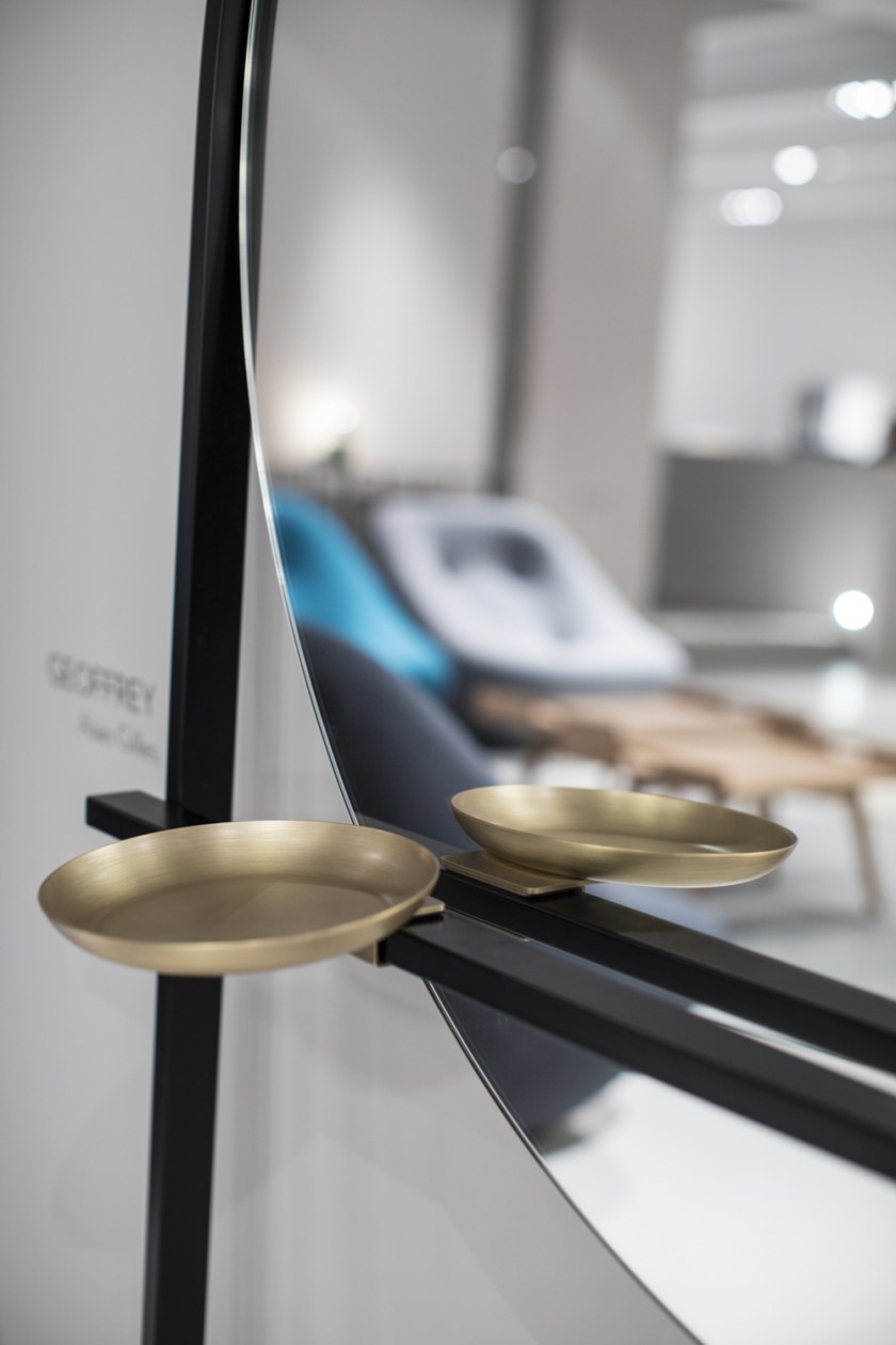 The Geoffrey mirror is a large, decorative and multi-functional piece. The mirror is connected to the metal structure in a way that it appears to be floating since the frame doesn’t extend fully around the mirror. The straight bar serves as a rail to the movable brass dish, giving the impression of a horizon and further reinforcing the impression that the mirror is floating since the bar is reflected in the gap.