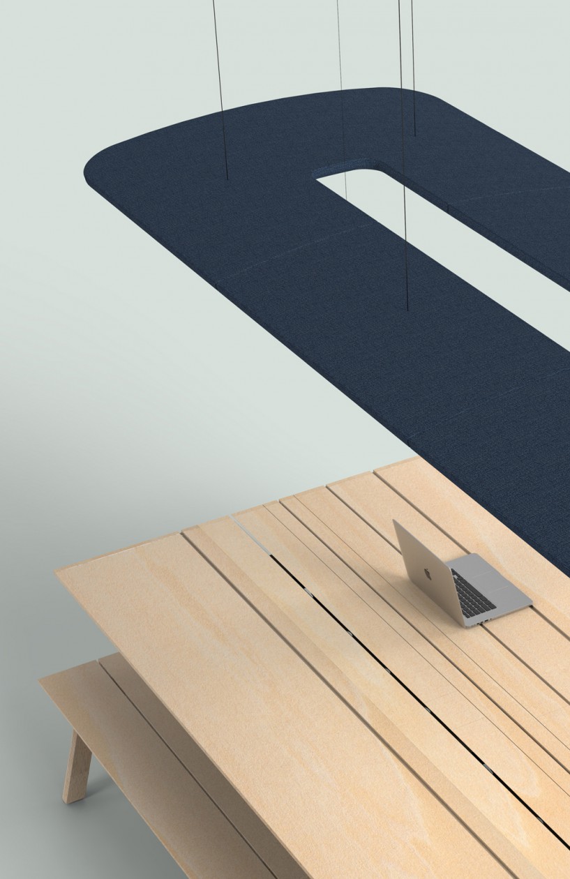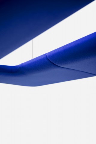 Het geluidspaneel, net als de verlichtingsmodule, zijn haast eindeloos te verlengen. De verschillende gestoffeerde panelen kunnen met elkaar worden verbonden door een zeer eenvoudig magnetisch systeem en vervolgens aan het plafond worden opgehangen.