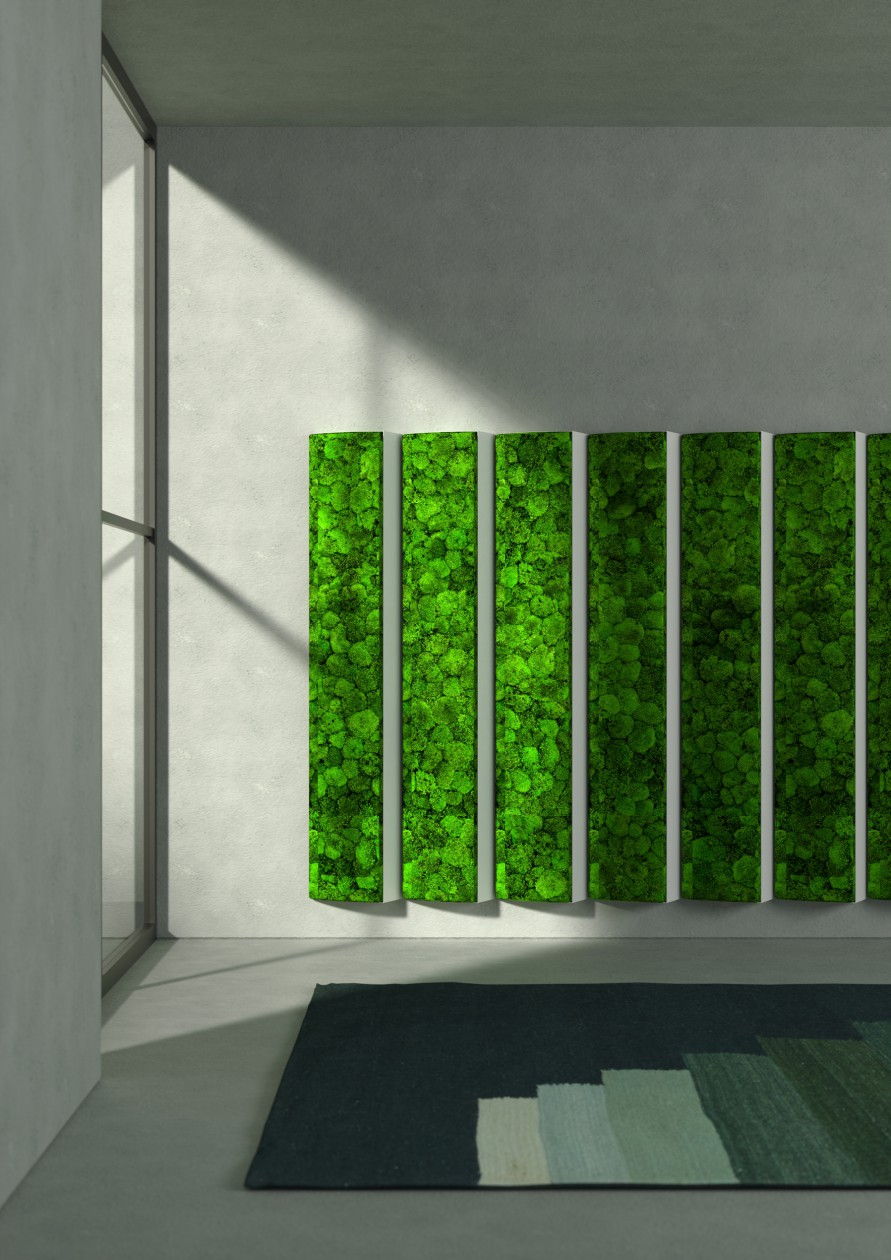De met mos bedekte elementen zijn perfect voor grotere ruimtes zoals ontvangstruimtes, gangen, kantoortuinen, wachtzalen en tentoonstellingsruimtes. Ze zijn geluiddempend, geven een gevoel van welzijn en vormen een naadloze natuurlijke aanvulling voor elke bedrijfsomgeving.