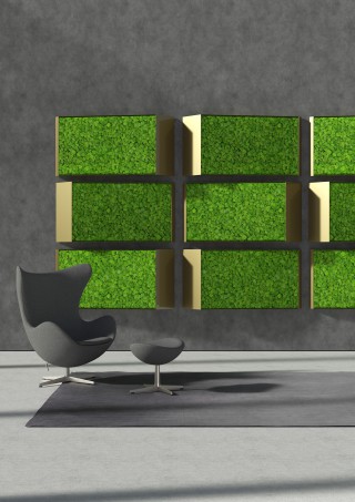 Deze met mos bedekte dozen, geïnspireerd dop de architecturale details van modernistische en brutalistische gevels, bieden de mogelijkheid om een binnenruimte op unieke wijze vorm te geven.