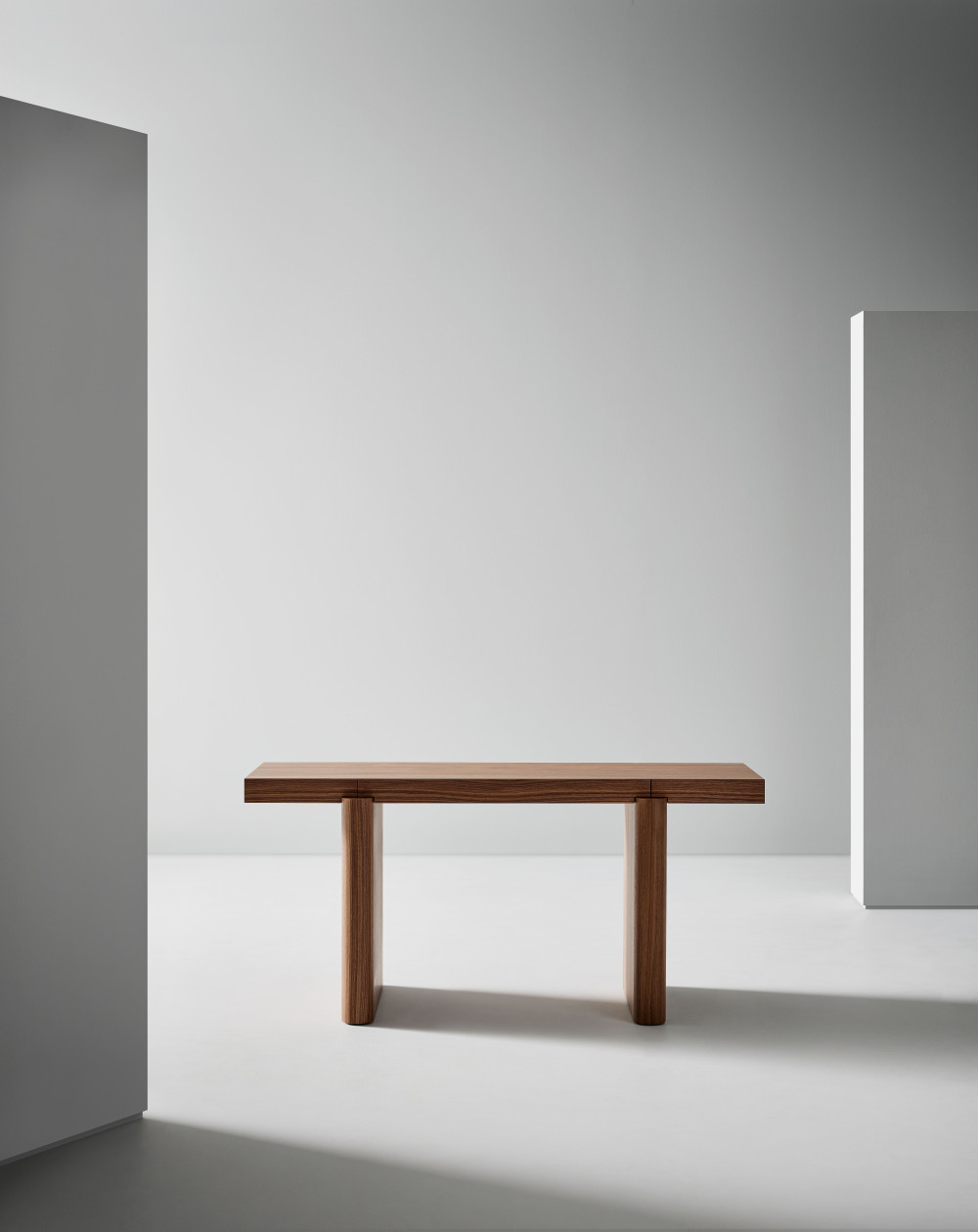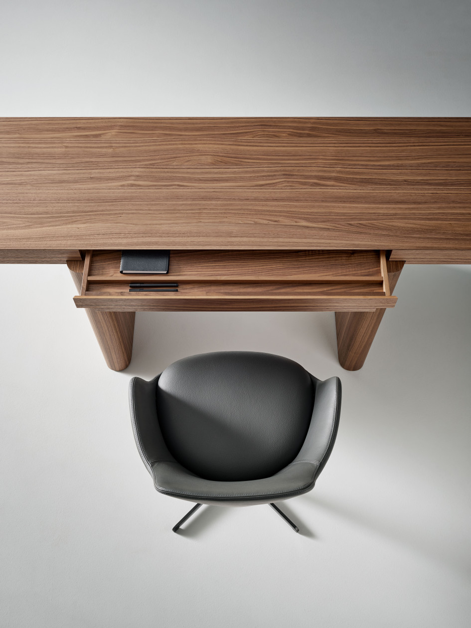 Binnen de collectie worden de typologie van de stukken en hun functionaliteit bepaald door de dikte en de afmetingen van elk rechthoekig blok. Het smalste, maar ook het meubel met het grootste contrast tussen de poten en het tafelblad is het persoonlijke bureau. Het is een zeer grafisch en sculpturaal meubel met opvallende, iconische proporties. Toch is het bedoeld als een functioneel meubel met zijn drie verborgen push-open lades, waarin men discreet kleinere voorwerpen zoals pennen, notitieblokken, opladers, tablets en laptops, enz. kan opbergen...