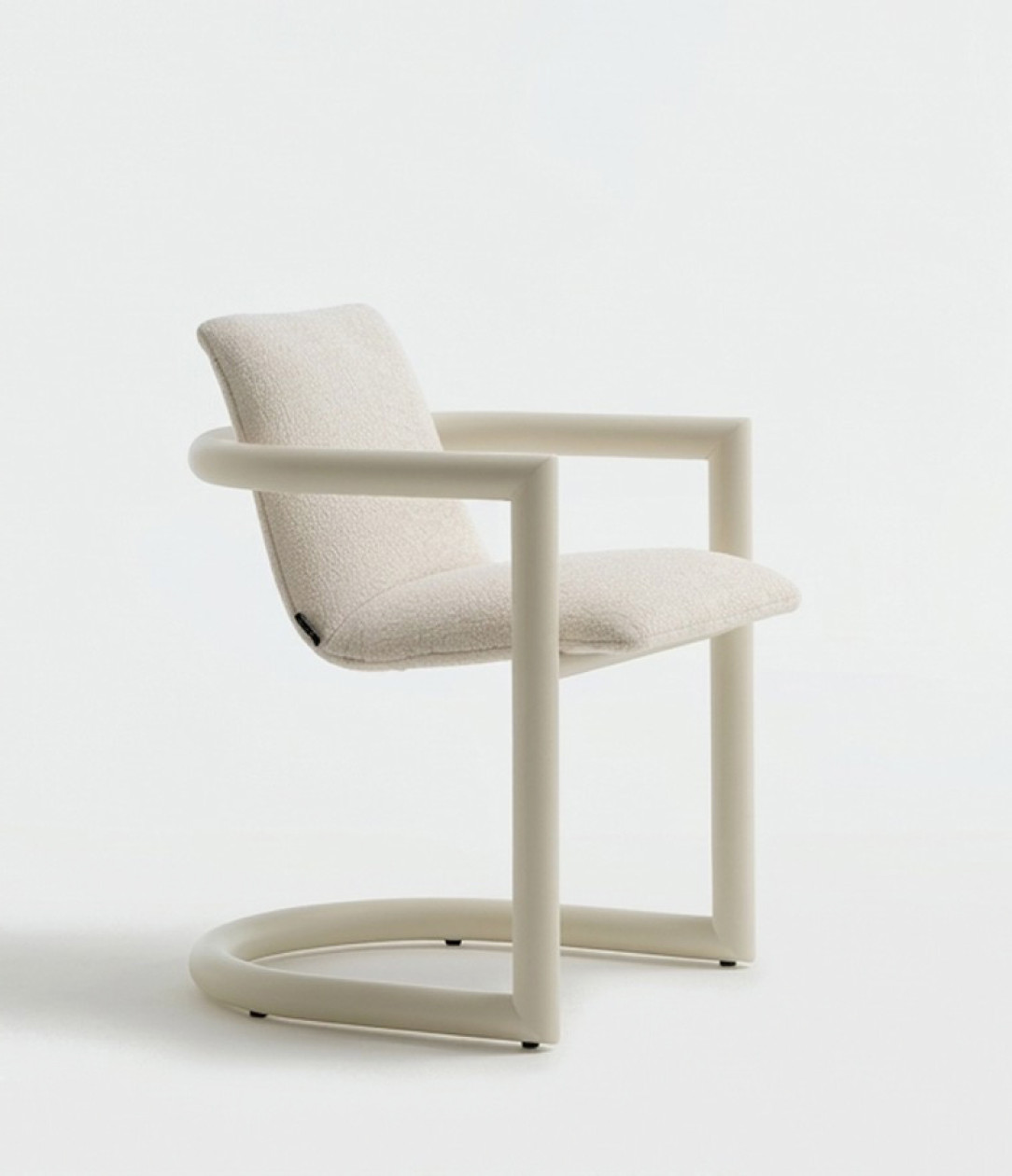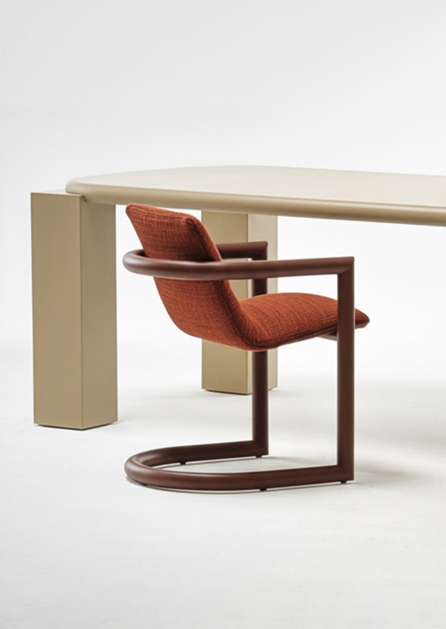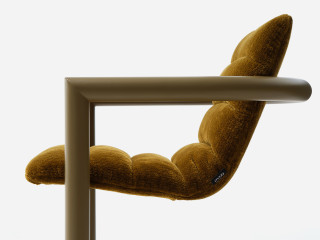 Voortbouwend op het baanbrekende werk van Mart Stam, Ludwig Mies van der Rohe en Marcel Breuer, geeft de stoel een nieuwe invulling aan het ontwerp en de productieprocessen van de schommelstoel. De metalen buis die de structuur van de stoel bepaalt, is niet langer de dunne, gebogen buis die kenmerkend is voor deze meubels; het is nu een grote, gedurfde buis die bestaat uit vier zorgvuldig gelaste delen. Het onderstel en de armleuningen zijn twee identieke, grafische en geometrische onderdelen die de indruk wekken dat het meubel in spiegelbeeld is weergegeven. Deze twee bogen zijn met elkaar verbonden door buizen, waardoor een complete structuur ontstaat die de zitting ondersteunt.