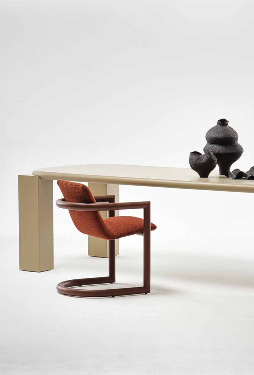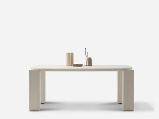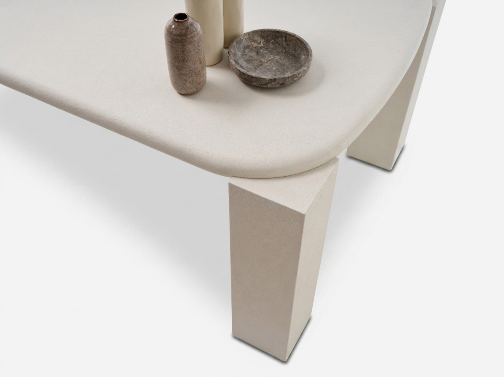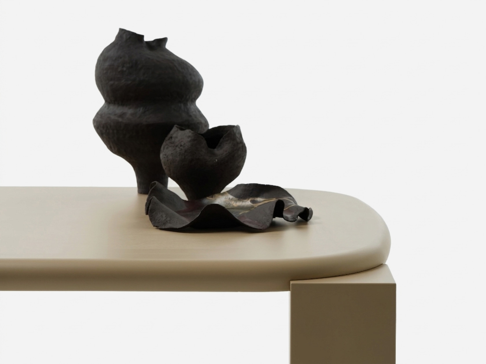 De collectie speelt met perceptie en creëert een dialoog tussen de verschillende elementen. De vier vierkante poten stralen kracht en stevigheid uit, maar lijken te smelten onder het gewicht van het tafelblad, dat beetje bij beetje lijkt te zakken alsof het materiaal zacht is. Hoewel het tafelblad met al zijn rondingen en vloeiende randen het zachtere, lichtere element lijkt, lijkt het plotseling het hardere, zwaardere te zijn. Met zijn volledig gebogen vorm lijkt het tafelblad meer op een snoepje of een stuk zeep dan op een tafelblad. Gebogen en rechte lijnen gaan in dit ontwerp een eindeloze interactie met elkaar aan.